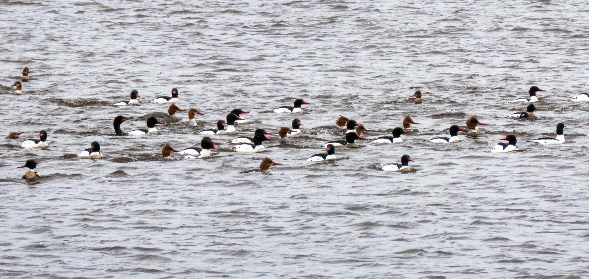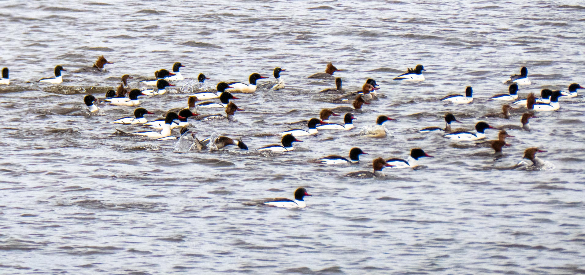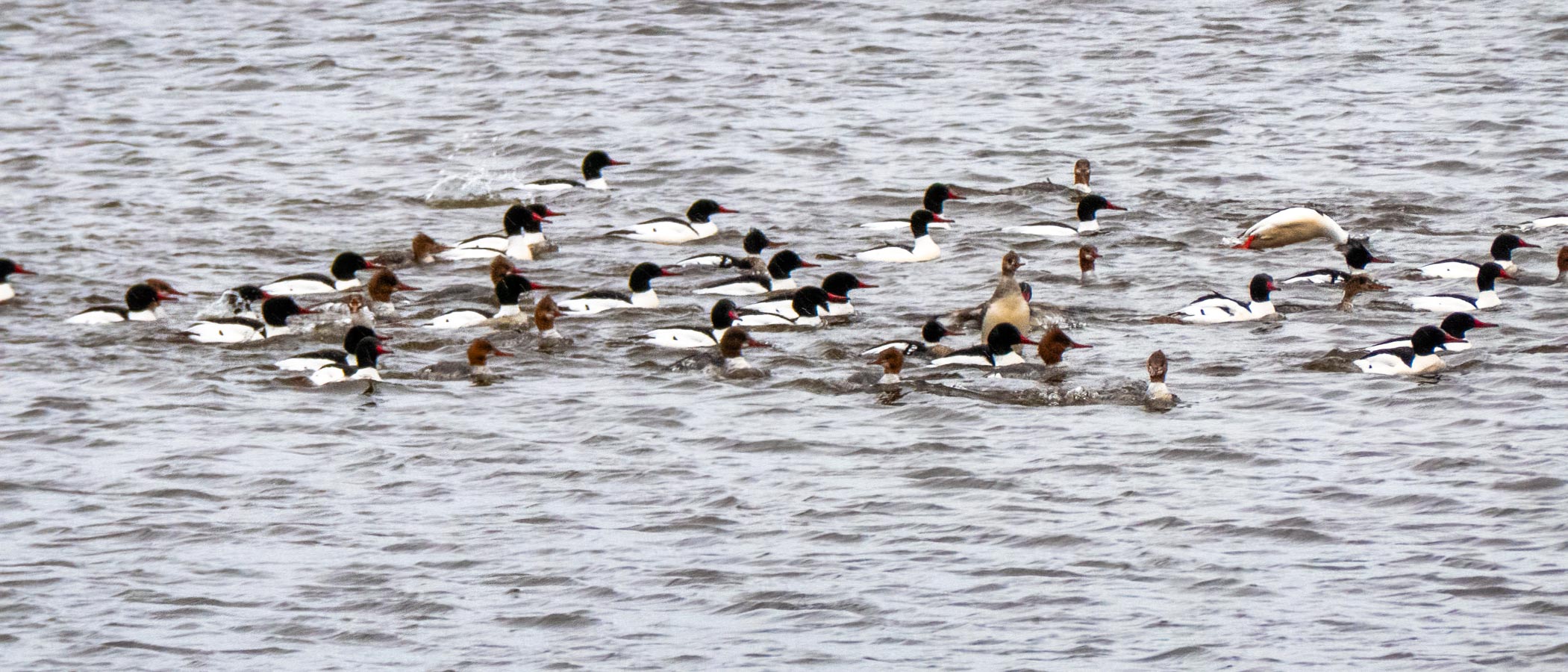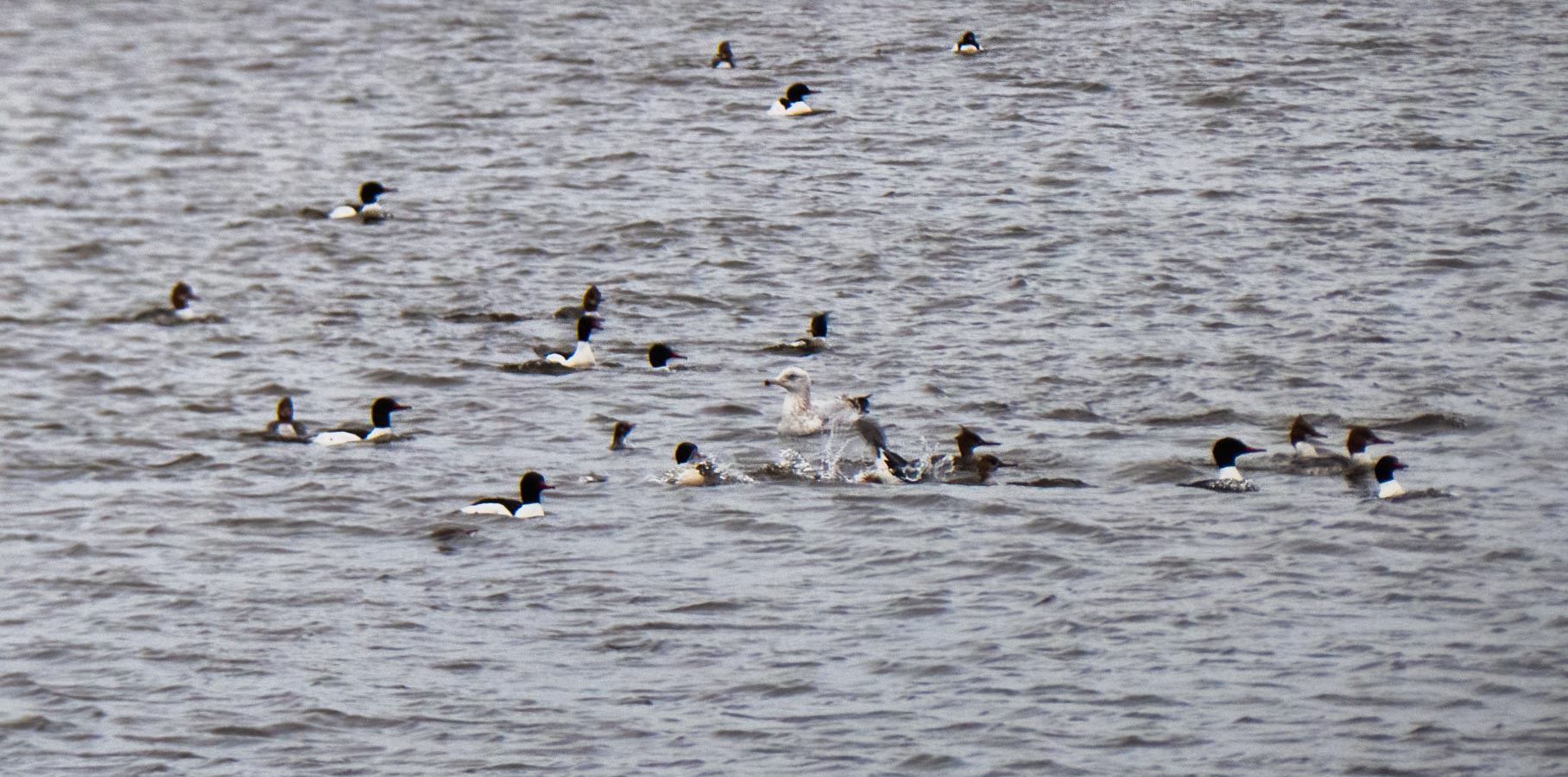 A Merganser feeding frenzy. Not sure what the gull is doing there.
