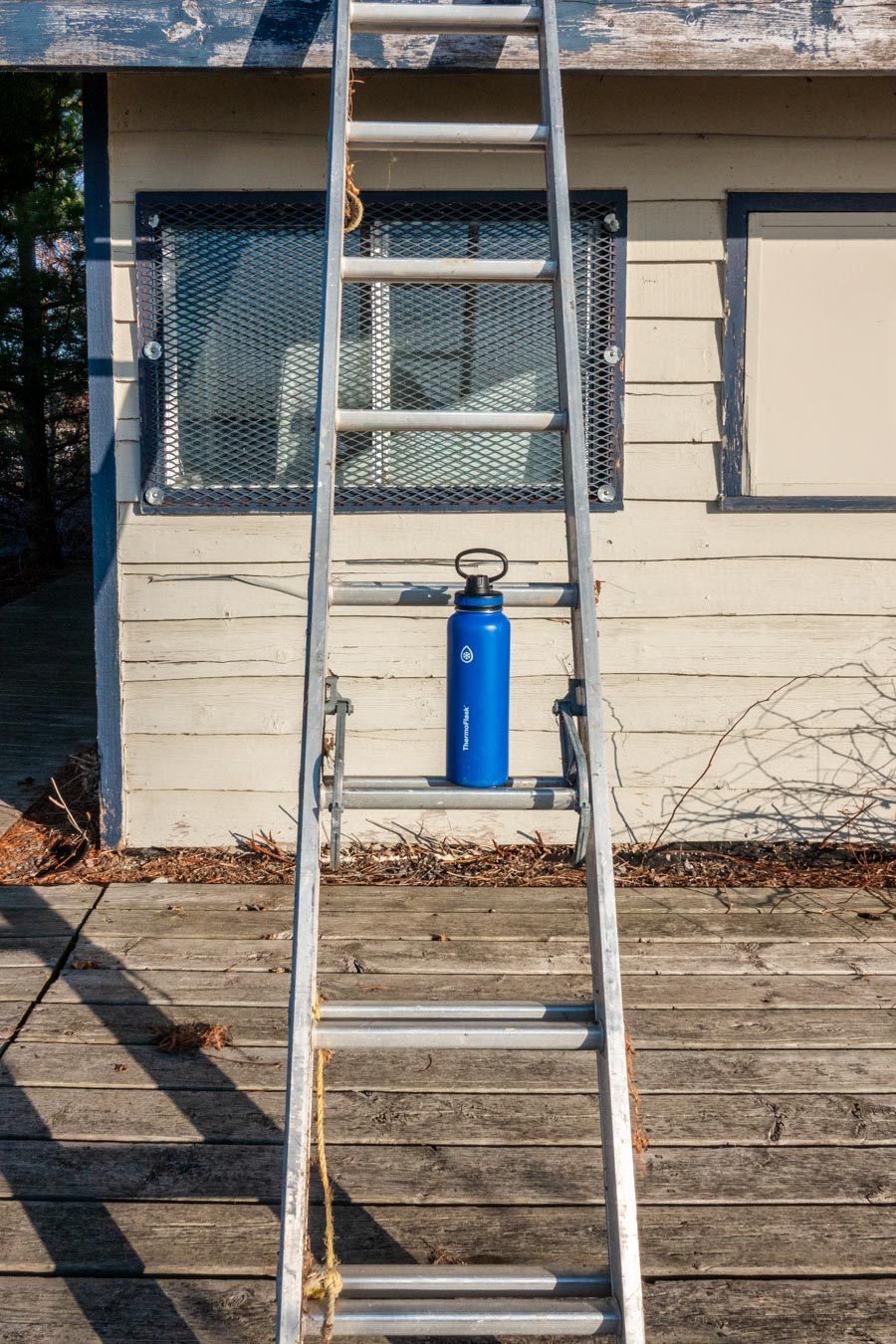 Not sure what is going on here. Ladder leading to the roof of the sailing club at the end of Pier 1. What is the worst that can happen?