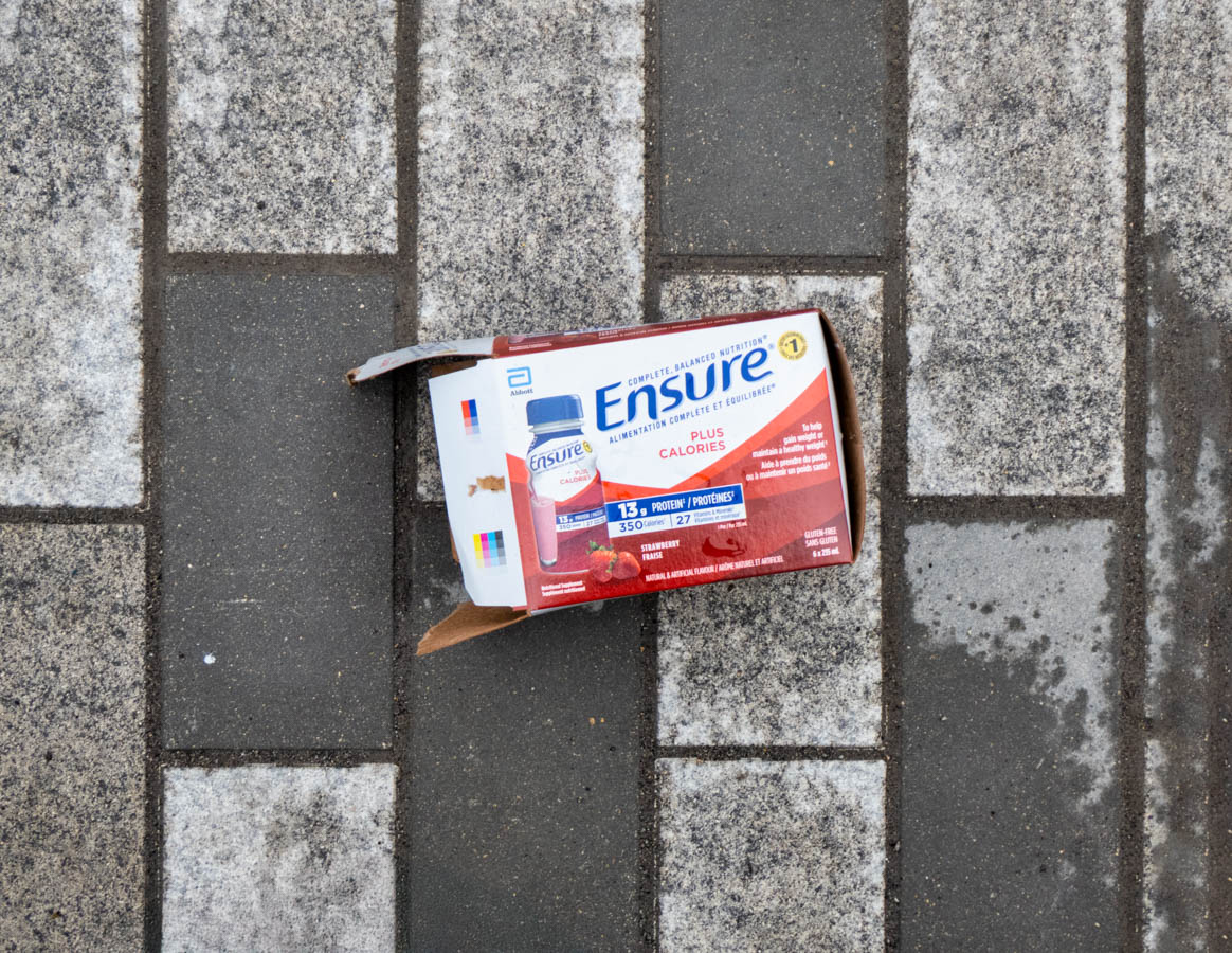 Trash in context. Discarded Ensure container.