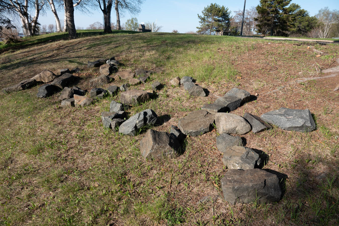 The remnants of the Rock Snake. Someone arranged them to spell the word ROCK. Move a couple of rocks and you have another word. Surprised that has not yet been done.