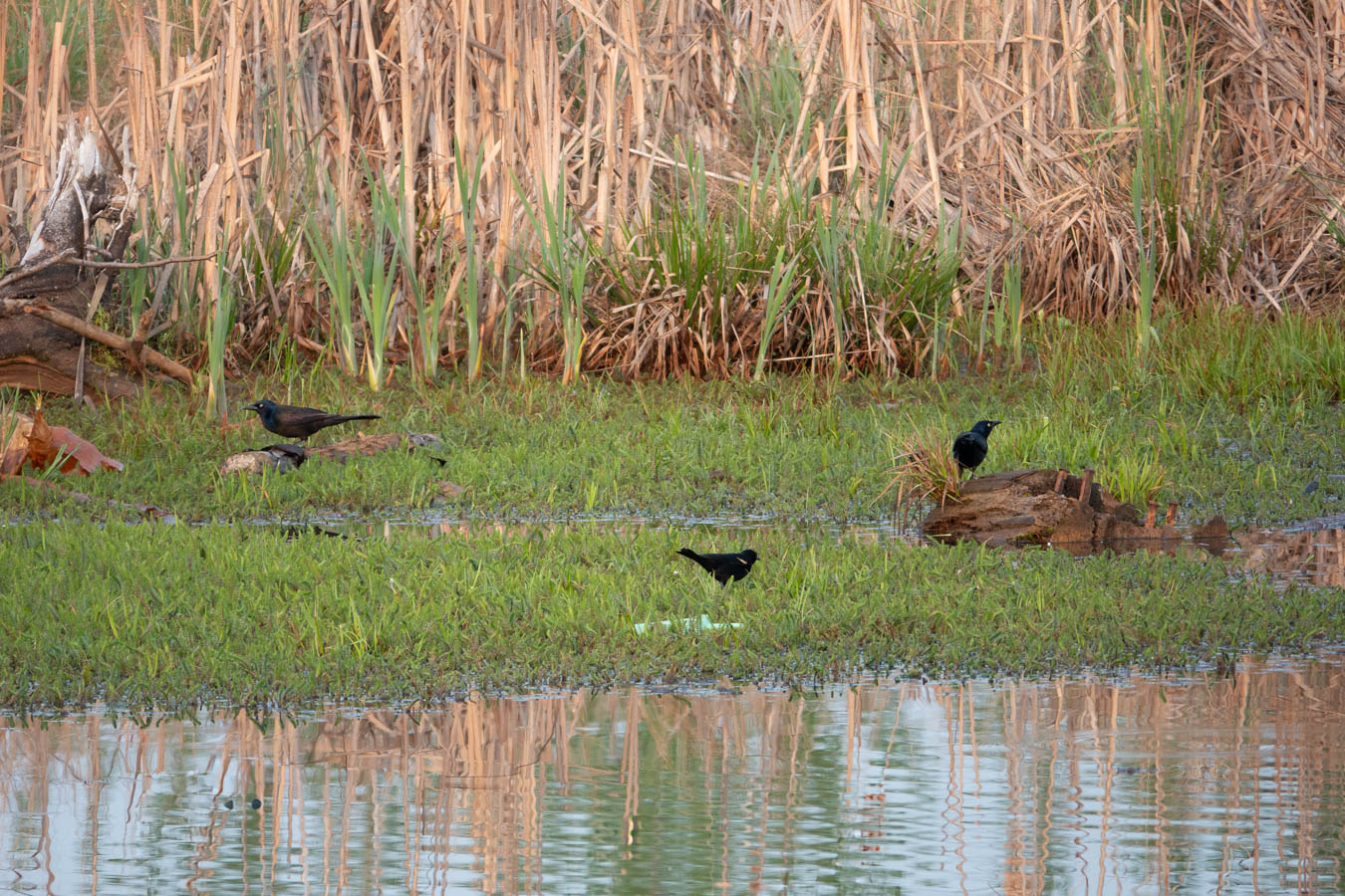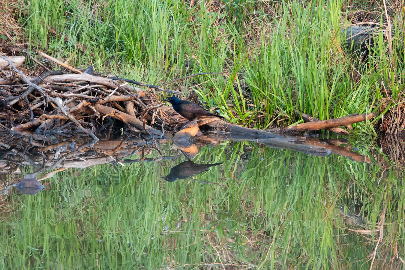 Common Grackle admiring its reflection