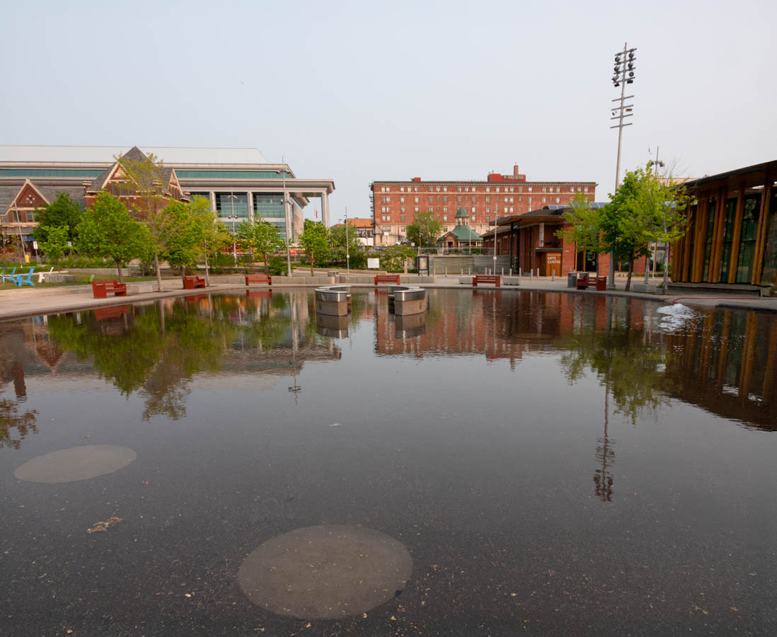 A real dog’s breakfast of architecture back there. Water is now in the fountain pond.