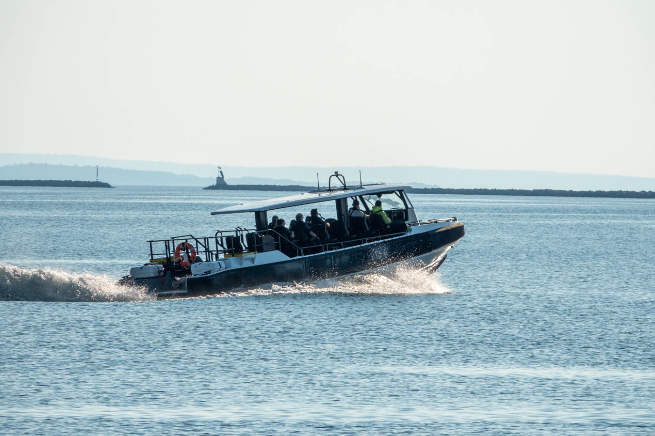 The shuttle boat speeding to catch up to the MV Viking Polaris