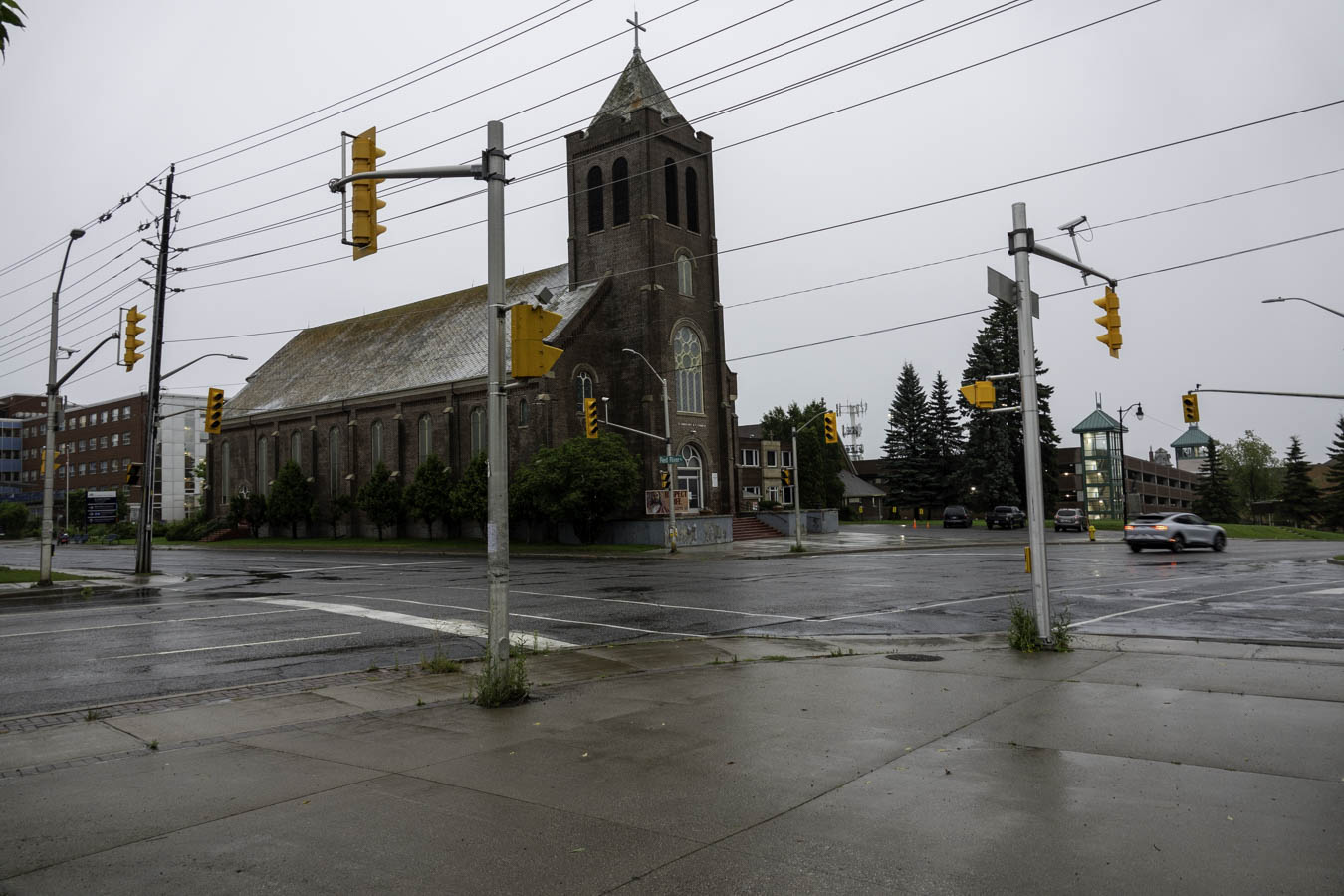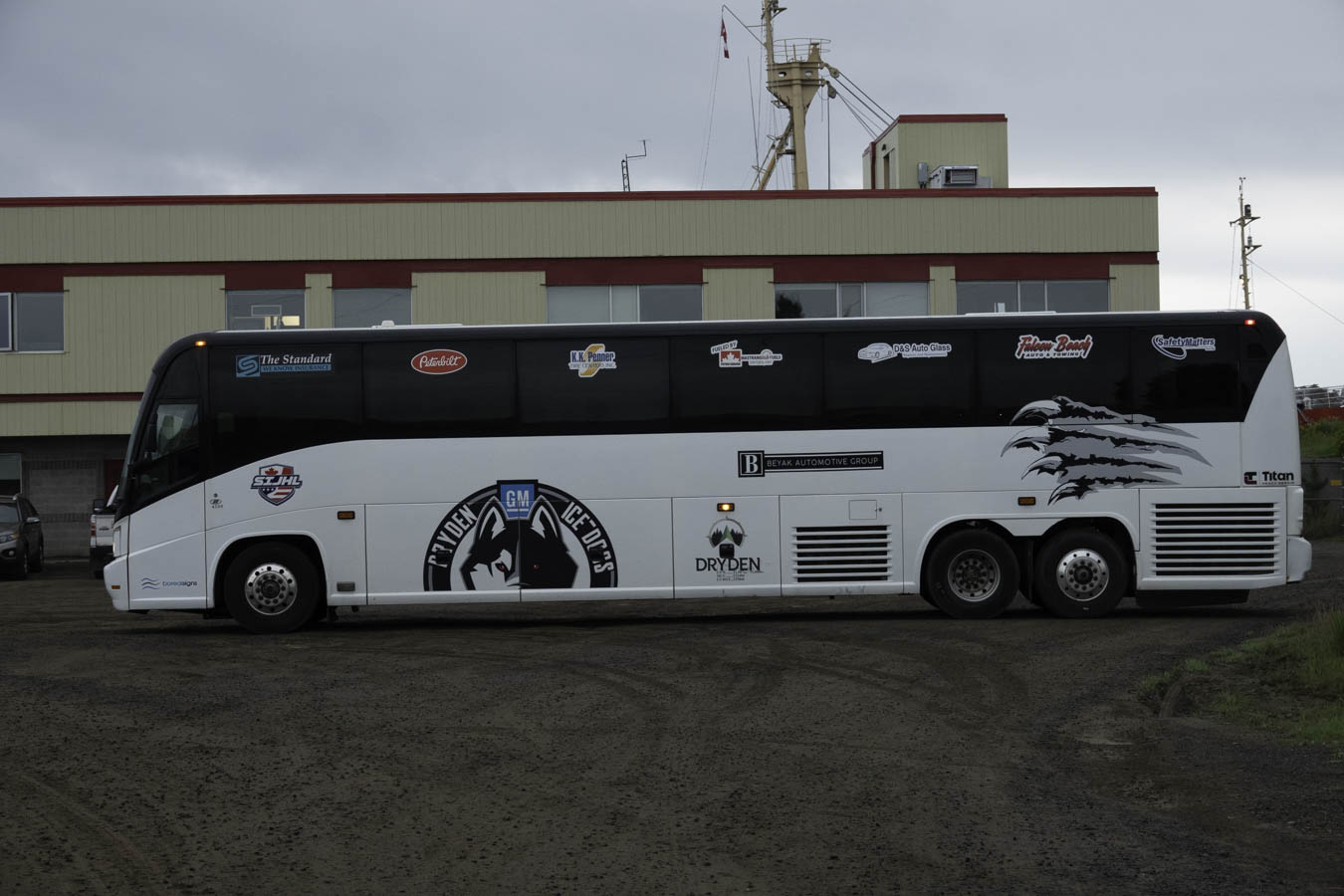 Dryden Ice Dogs bus. Dryden’s hockey team in the SIJHL.  Its being used to carry passengers from the cruise ship.