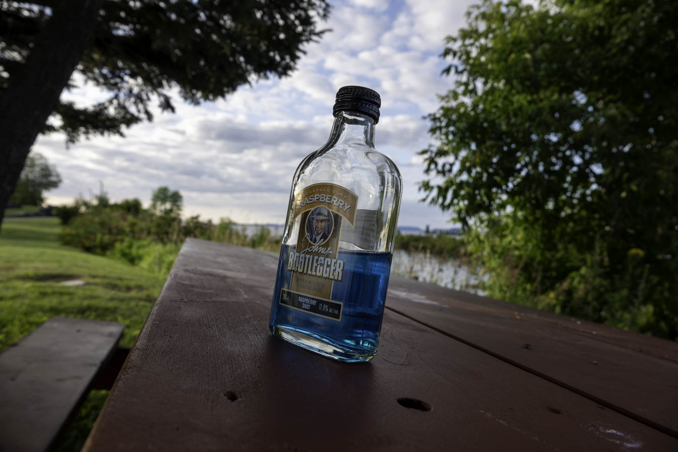 Half empty or half full? I can honestly say that I have never seen one of these Johnny Bootlegger bottles that was not empty. A rare sight. Are raspberries blue?