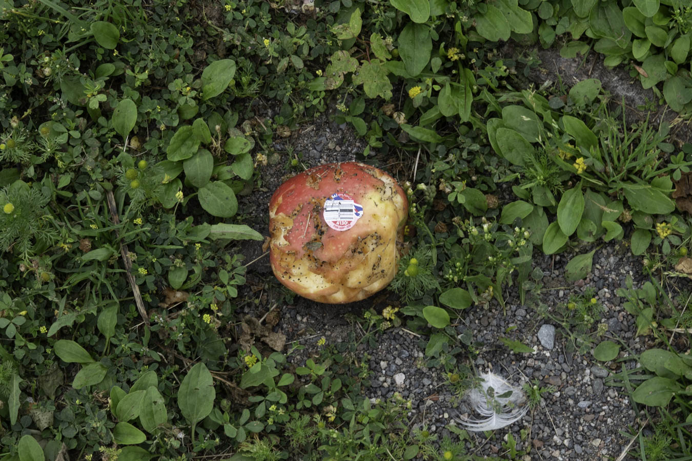 Discarded food item. Someone paid for that apple and gave it to someone who then tossed away. The person who discarded the piece of fruit did not pay for it. Nobody would pay for an apple and then throw it away.