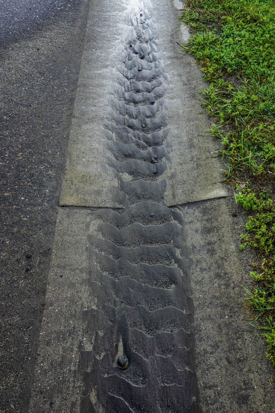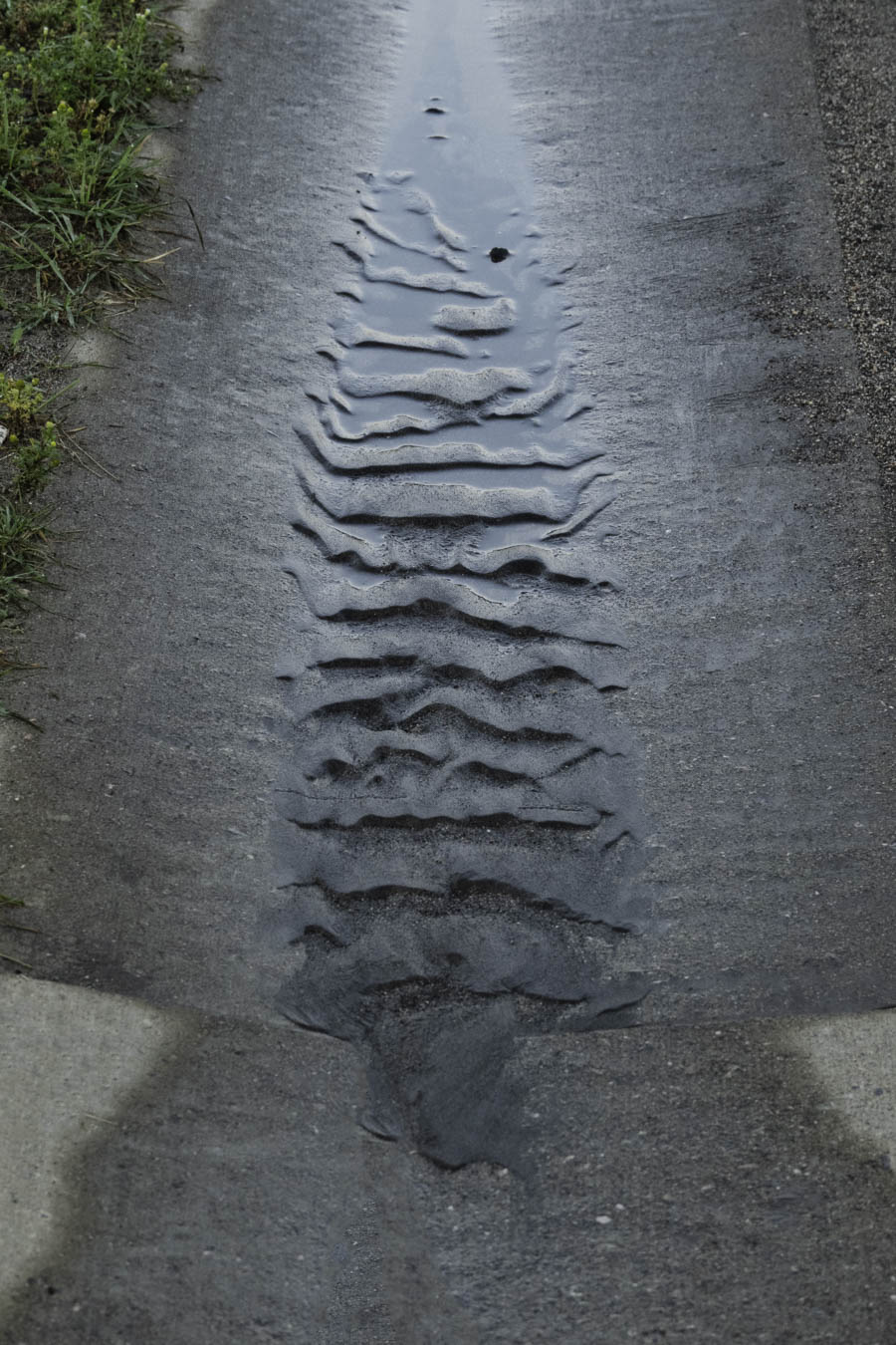 Rain washes sand into the gutter. Water flow slows and sand drops. You end up with this