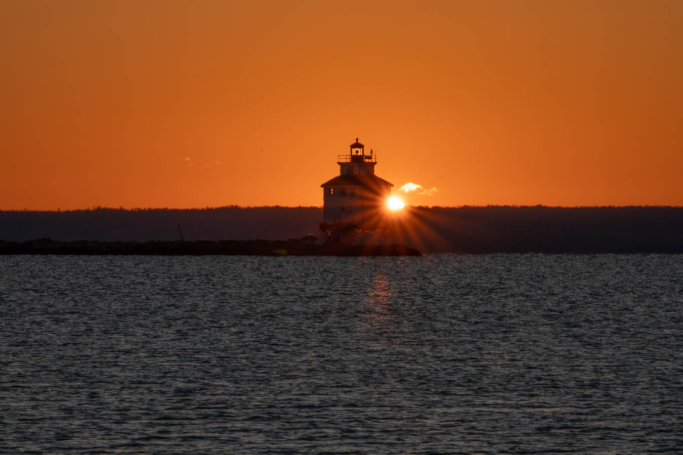 There is the sun peeking from behind the lighthouse