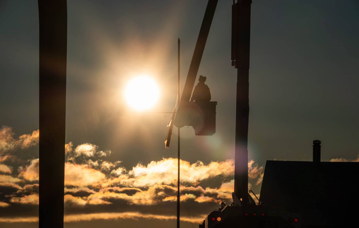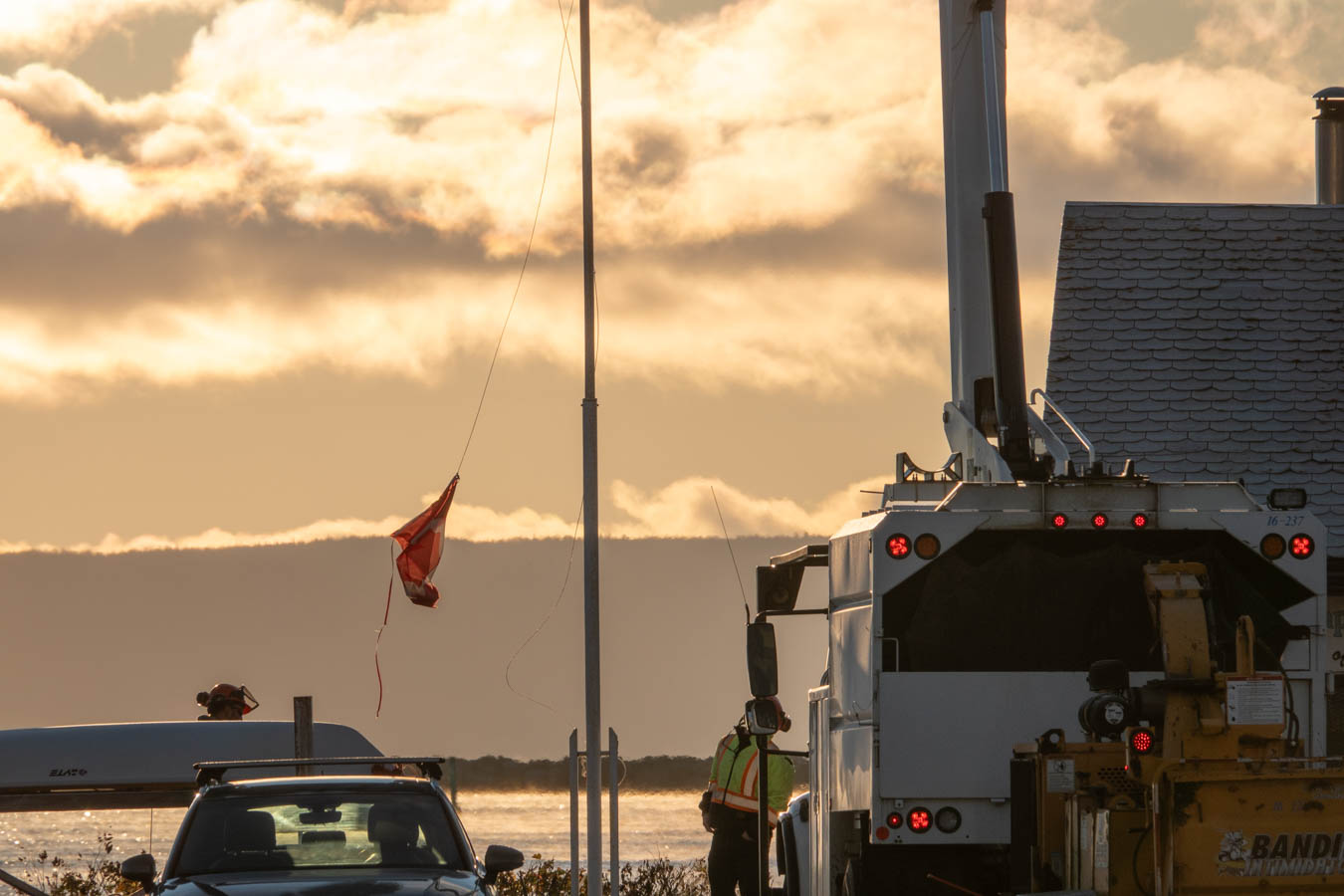 The City of Thunder Bay brought in one of its ‘cherry picker’ buckets to remove what’s left of the Canadian flag at the Temple Reef Sailing club at the end of Pier 1. The ropes that the flag were attached to had wrapped themselves into a mess.