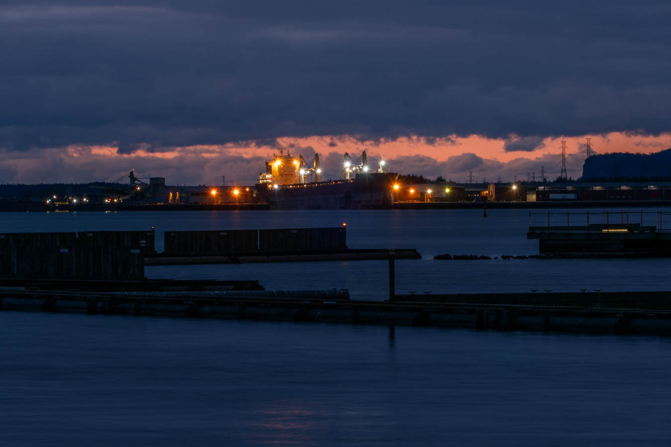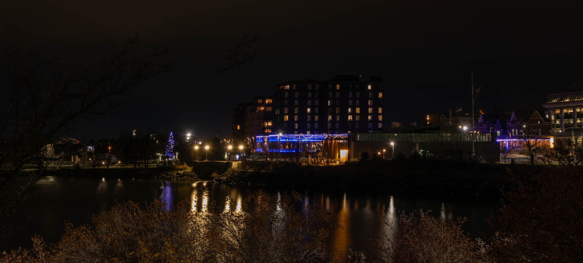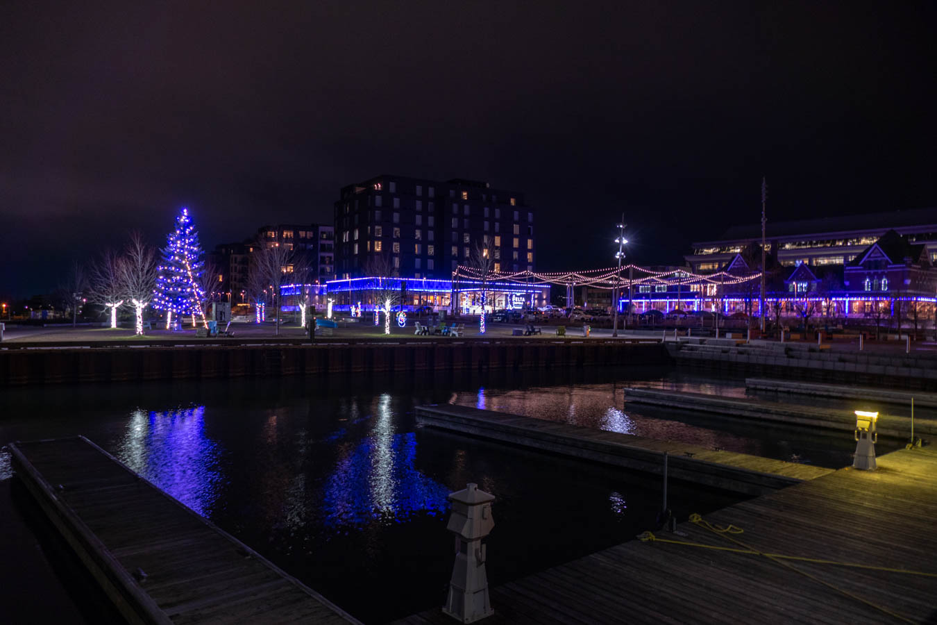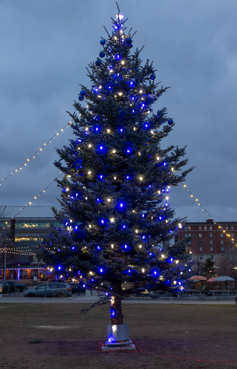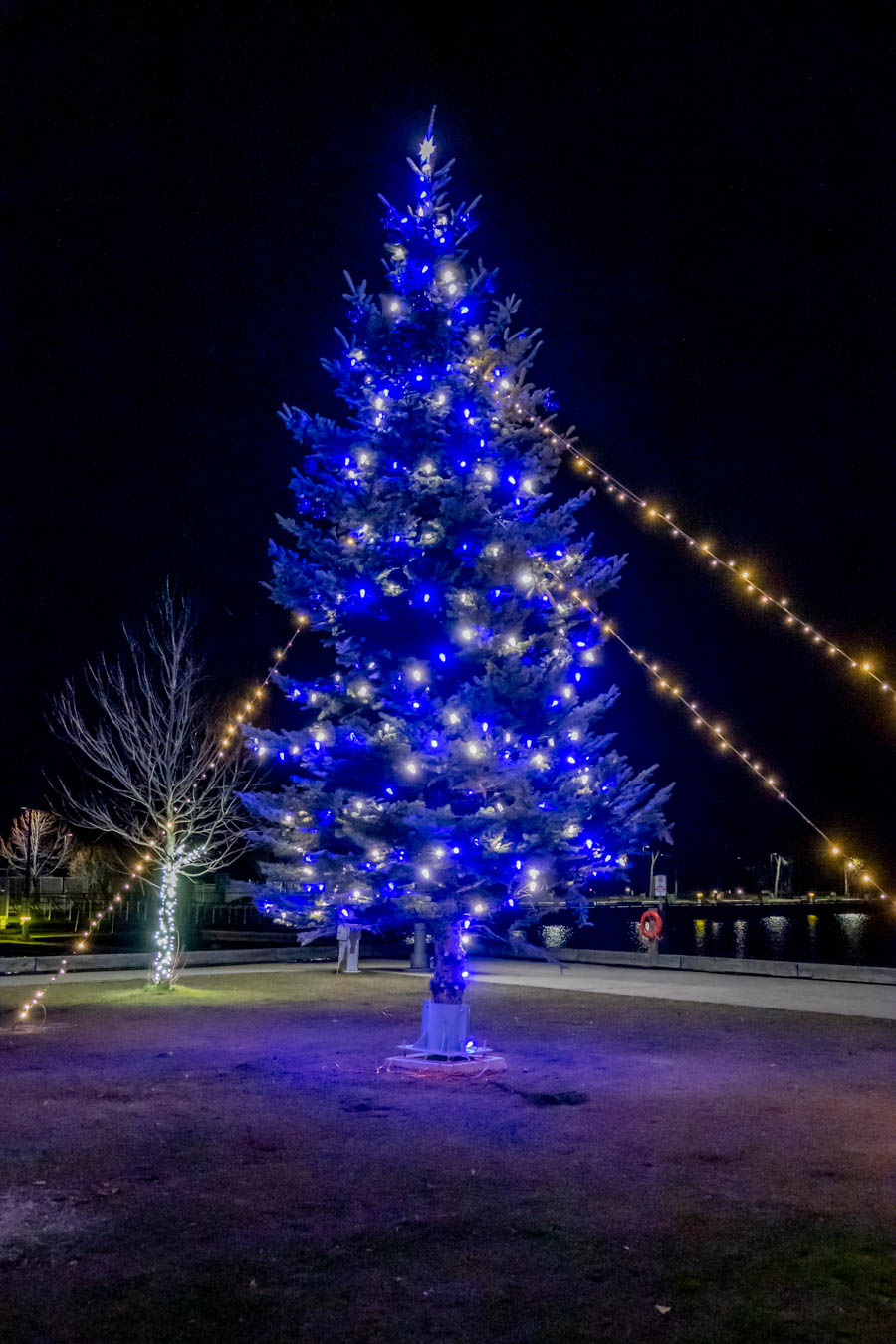 The Christmas tree in Marina Park’s Waterfront Plaza has lights on it.  Blue and white lights.  I am more of a ‘lots of colours’ when it comes to Christmas tree lights.  I guess this colour combo is a theme for the entire area. Hotel and train station.