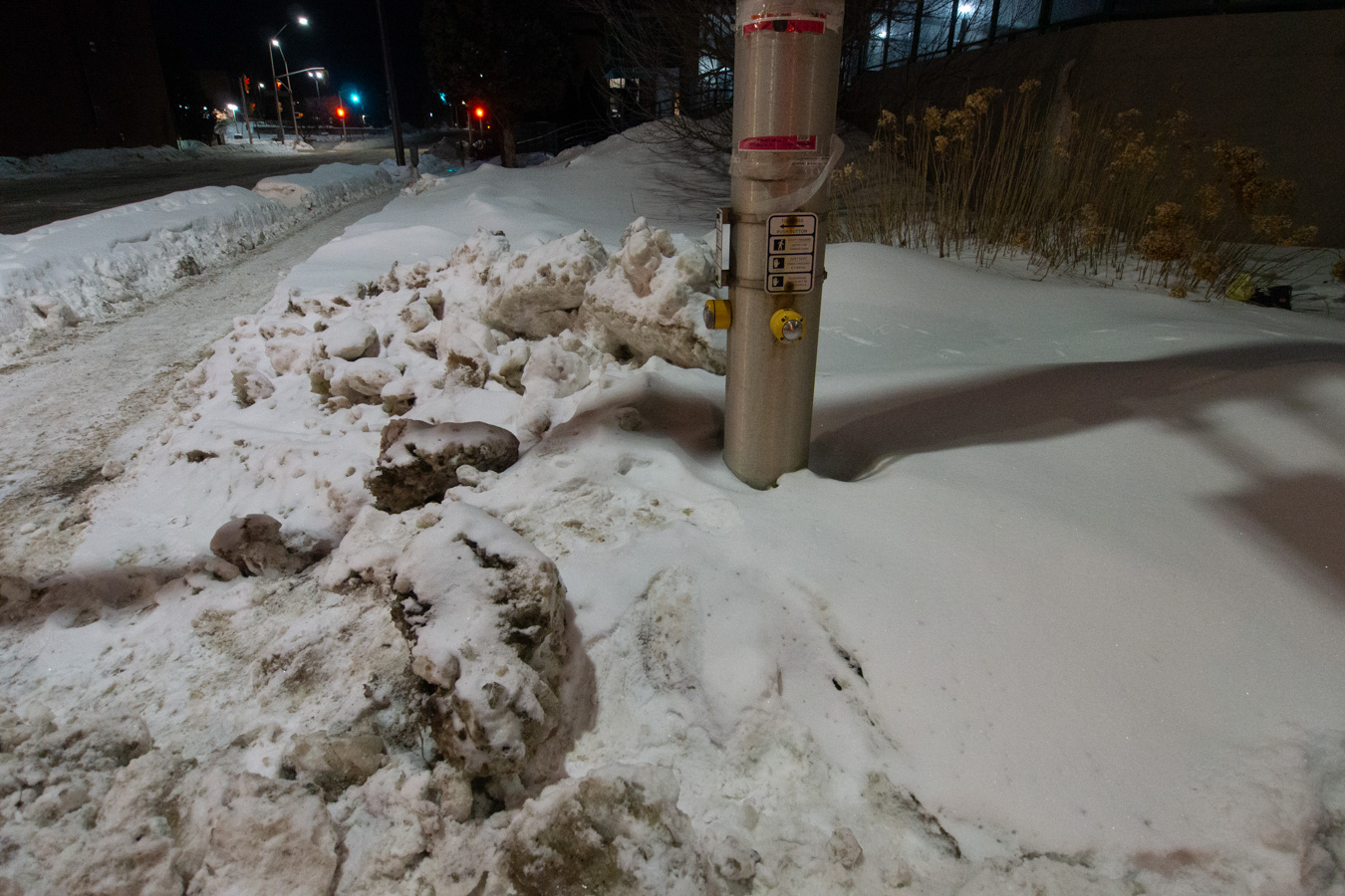 Just how is a person supposed to get to the buttons?  Seriously?   Its very dangerous to even try. You have to climb up a slippy slope.  Another example of how pedestrians in Thunder Bay are treated.  We pay taxes too.