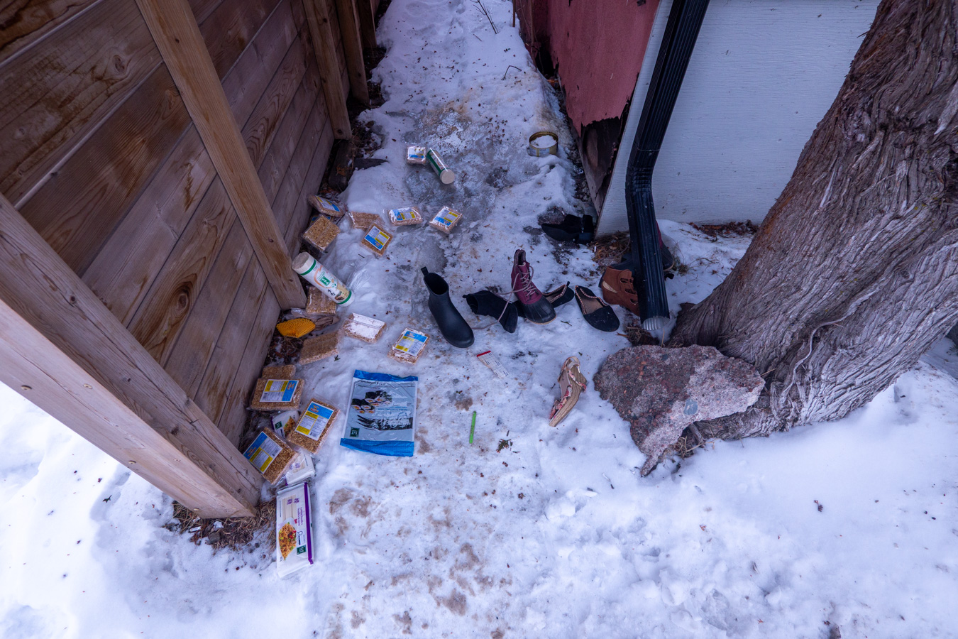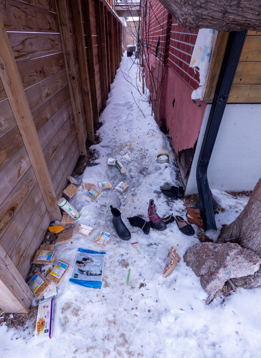 Its a sign of the times I guess.  Looks like there are several unopened packages of something there.  The shoes and boots? Who the hell knows?