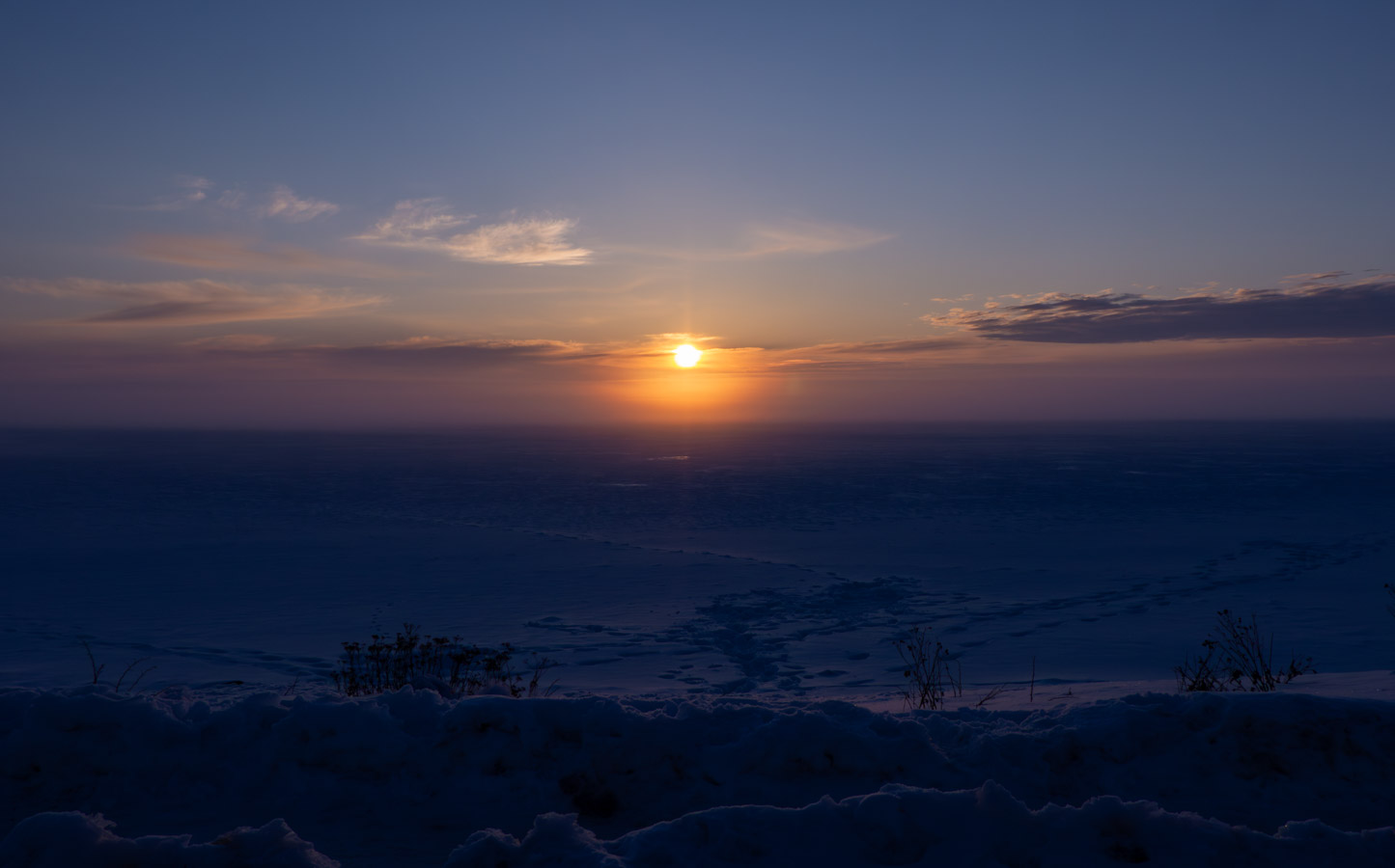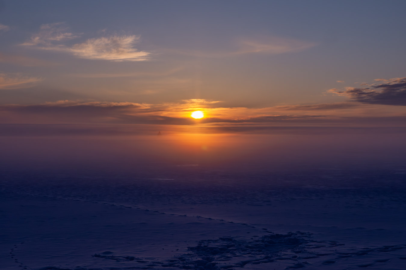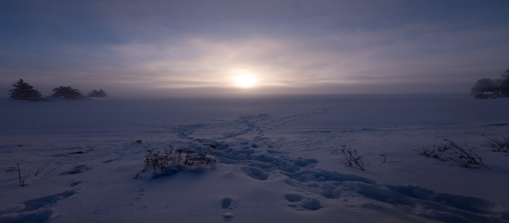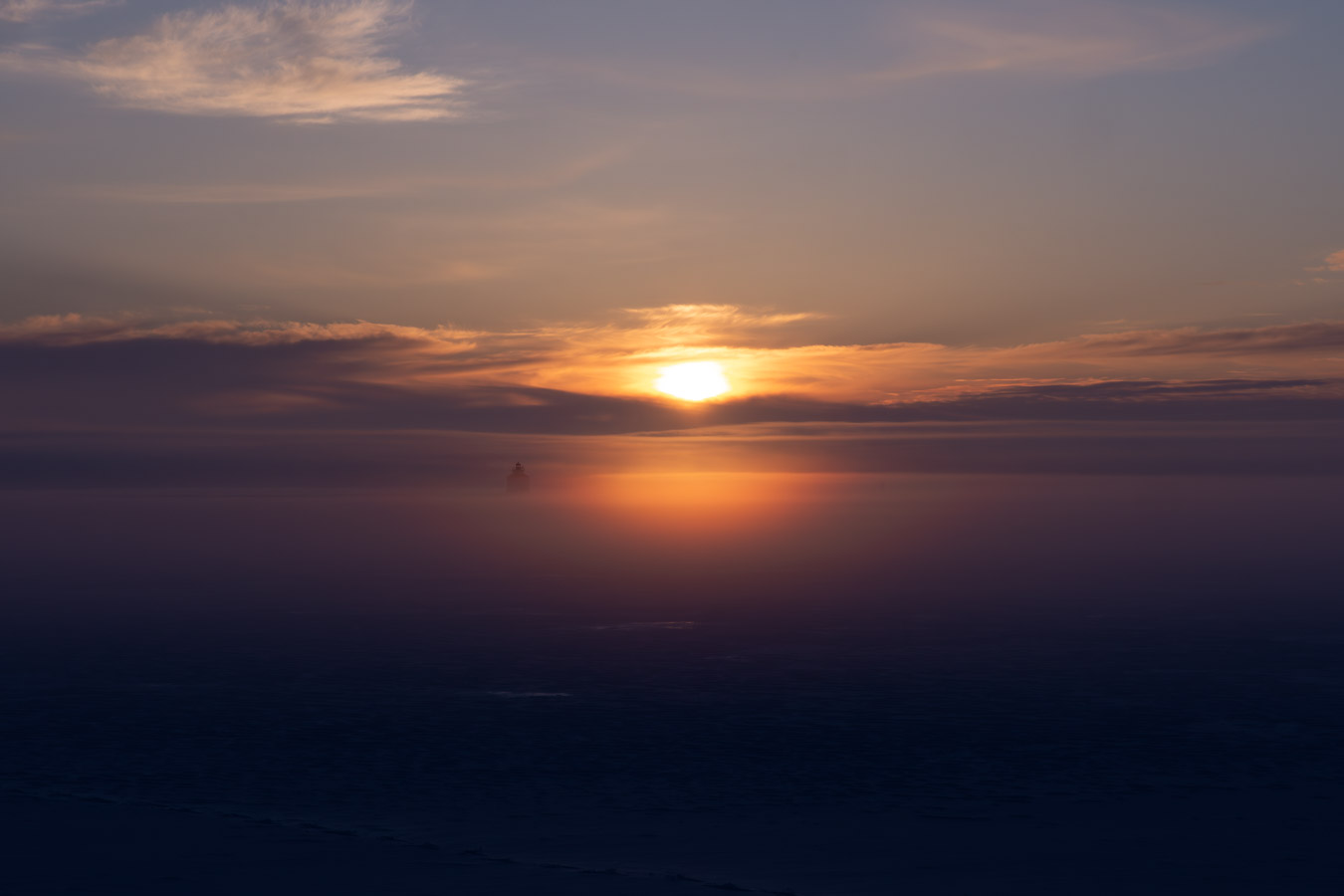 The sun starting to make its presence known. Mist/fog starting to roll in.