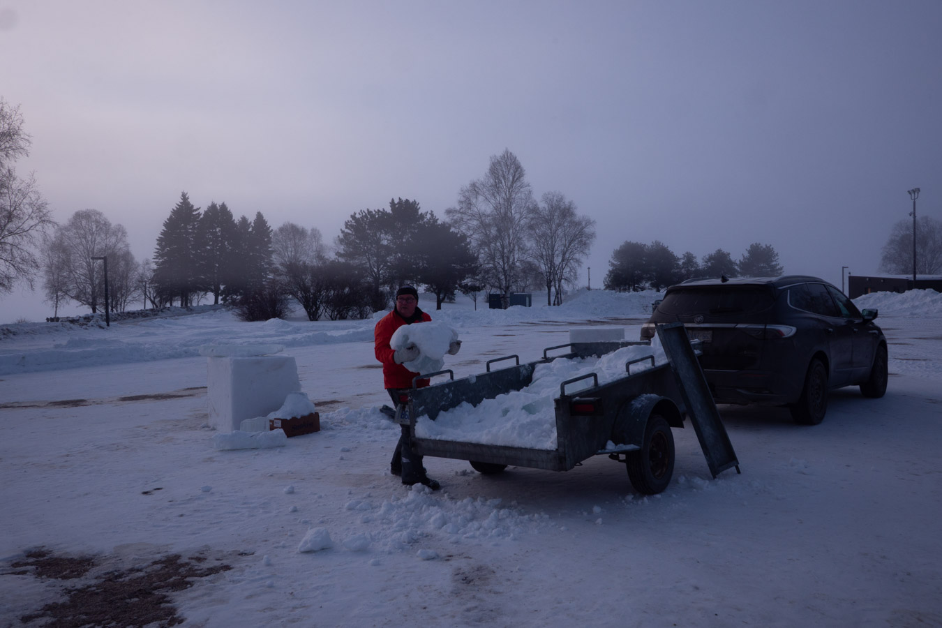 Schreiber’s snowshoe art guy, Kim Asmussen, installing ice sculptures.